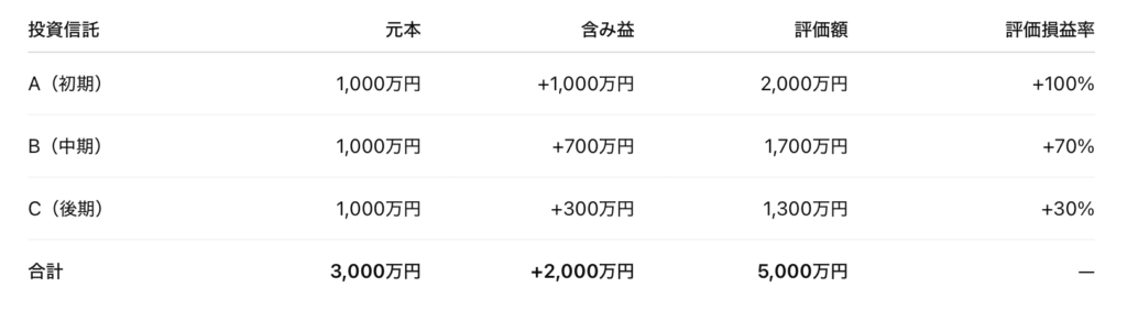 例:3本の投資信託を時期をずらして購入した場合
