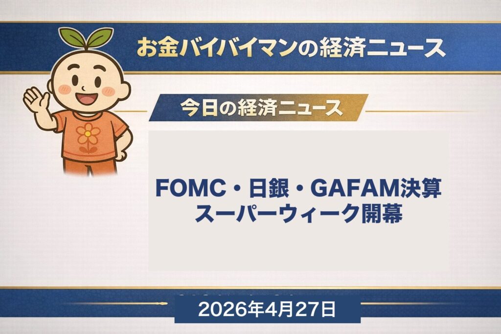 DAILY MARKET NOTE · 2026.04.27(月) 📅 今週のマーケット予定 / 日銀・FOMC・GAFAM決算が同週集中するスーパーウィーク開幕 先週末の日米市場は半導体株を中心に揃って高値圏で着地。今週は日銀(4/27-28)、FOMC(4/28-29)、ECB(4/30)の3中銀会合に...